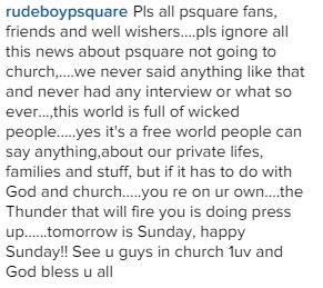 Pop duo, Paul and Peter Okoye ‘Psquare‘ are not happy with reports that they’ve stopped going to church since 2007.