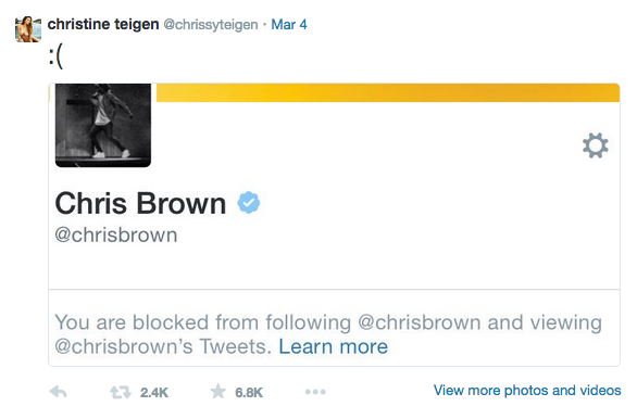 The 29-year old model took to her Twitter account on Wednesday, March 4, 2015 to make it public that the ‘Loyal’ hitmaker has blocked her on the social media site by sharing a screen shot of the prompt from the social media site.