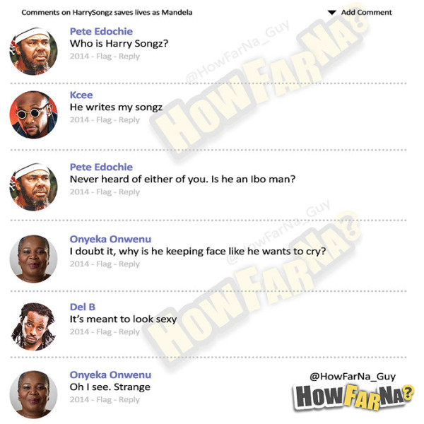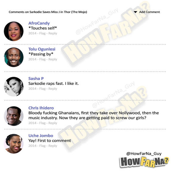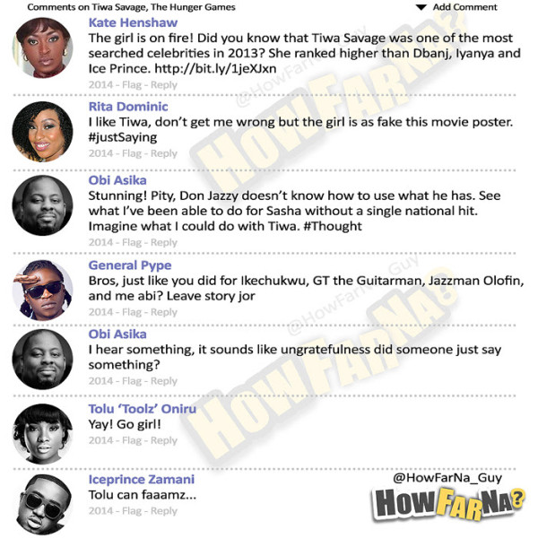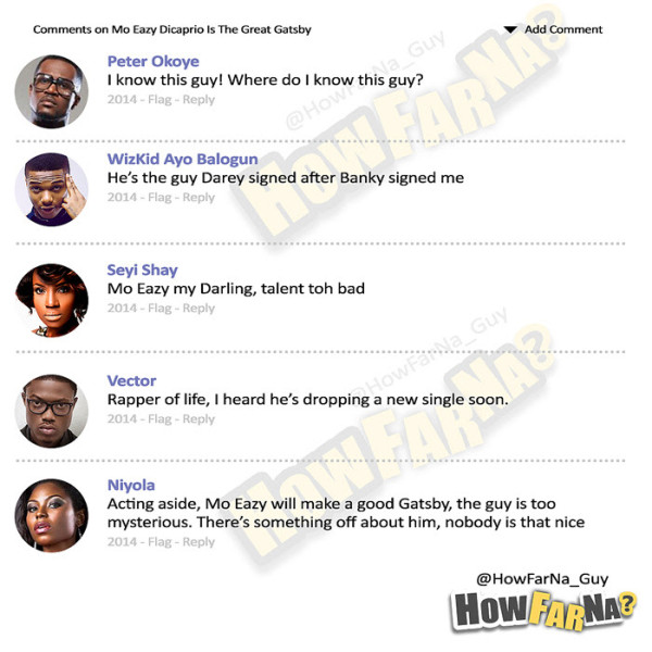 We’ve noticed something strange though: how did little known rapper Mo’Eazy get all up in here with big names like D’banj, Tiwa Savage and co? And why were his own comments all positive compared to the lashing the others got?