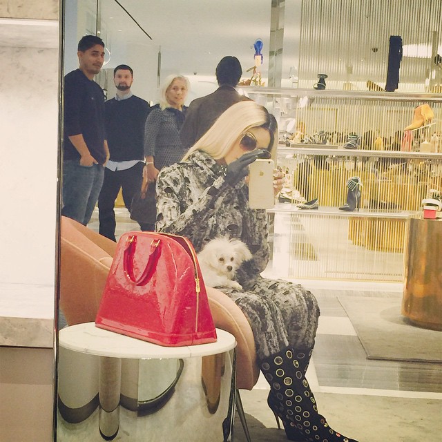 The whitenicious entrepreneur posted this picture of herself on Instagram fully clad in a turtleneck jumpsuit, boots, her vibrant red handbag and posing with her dog to for a selfie in a shoe shop.