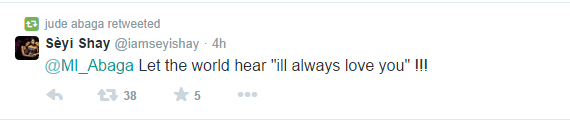 Today, October 1, 2014, Seyi Shay tweeted at rapper M.I Abaga writing: ‘Let the world hear I’ll always love you’ and almost Instantly, M.I retweeted the post and it’s sparked up a buzz online, many of their followers and fans wondering if whatever is going on between them has any similarity of a love relationship.