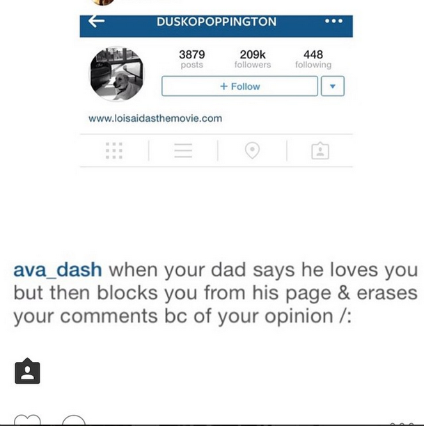 ‘When your dad says he loves you but then blocks you from his page and erases your comments bc (because) of your opinion :/’