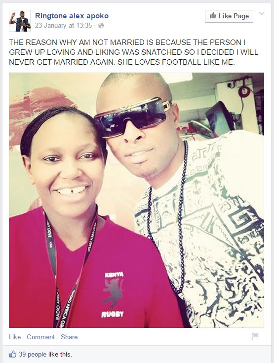 The ‘Party Leo’ singer took to his Facebook account on Friday, January 23, 2015, to share a photo with Kiss 100 FM presenter, Carol Radull, explaining that she is the reason he still single, because he had earlier wished to marry Carol who is now married to someone else.