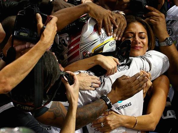 The 36-year-old singer couldn’t hide her emotion after the Mercedes racer triumphed in the Abu Dhabi Grand Prix as she greeted him back in the pit lane with a big kiss and began blubbing before he showered her in champagne to celebrate his victory.