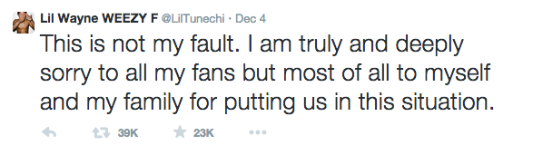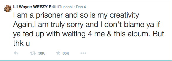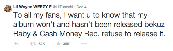 In a series of candid tweets on Thursday, December 4, Weezy revealed that his long-awaited album ‘Tha Carter V’, which was due December 9, wouldn’t be released because Birdman and Cash Money refuse to put it out.