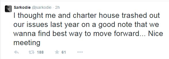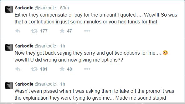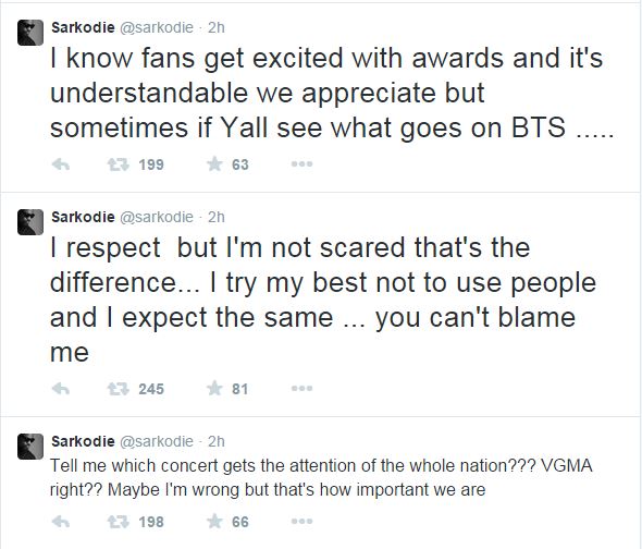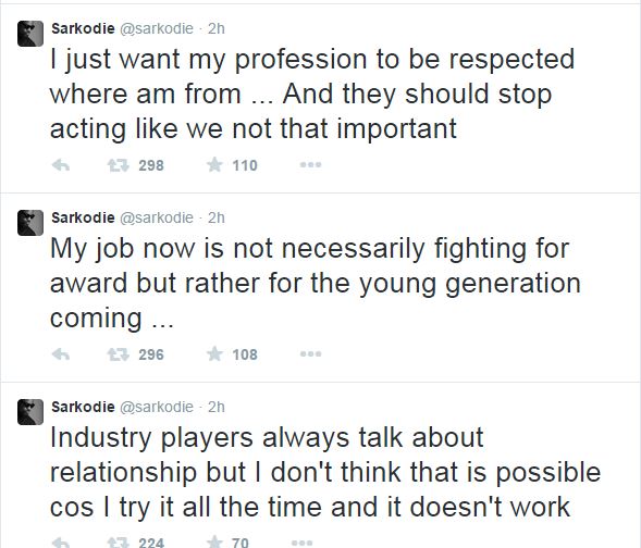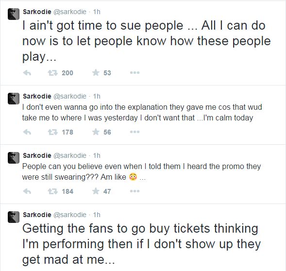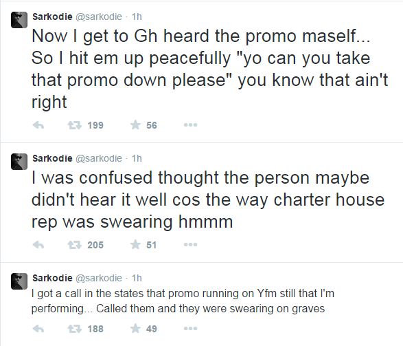 The ‘Adonai’ rapper, obviously not satisfied with the organisers’ handling of their decision to join some music acts as headliners for the 2015 Vodafone Ghana Music Award, posted several tweets since Monday, April 6, 2015. In particular, Sarkodie blames organisers for putting his name on the gig’s promo material while an agreement on that is not in place.