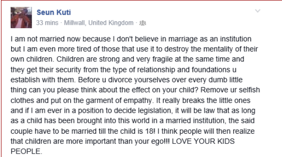 In Seun Kuti’s case, he explained how he doesn’t believe in the institution of marriage, and how he feels married couples owe their children the obligation of avoiding divorce until said children reach the age of at least 18.