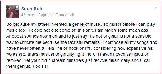 The singer, who now leads the Egypt 80 Band of his late father, Fela Kuti took to his Facebook page today, Friday, October 17, 2014, to post a note at those he described as critics, branding them ‘fools’ by the time he was done.