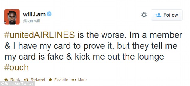 Will.i.am posted on Twitter: ‘#unitedAIRLINES is the worse. Im a member & I have my card to prove it. but they tell me my card is fake & kick me out the lounge #ouch (sic).’