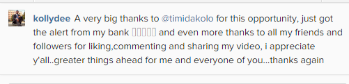 Kolly Dee who won the competition, just confirmed receiving his cash prize saying: ‘A very big thanks to Timi Dakolo for this opportunity, just got the alert from my bank and even more thanks to all my friends and followers for liking, commenting and sharing my video, i appreciate y’all. Greater things ahead for me and every one of you…thanks again.’