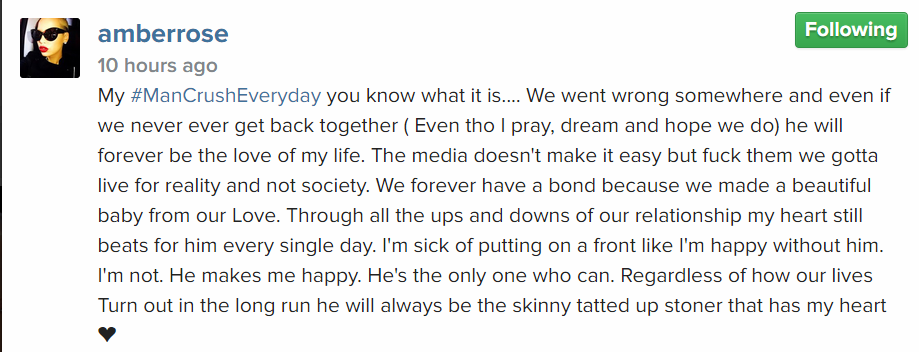 In February, Amber Rose said she’s done crying over Wiz Khalifa. Fast forward to April 2015, the mother of one has changed her tone and this time, she writes a long note on how lovely the father of her child is and how incomplete she feels without him.