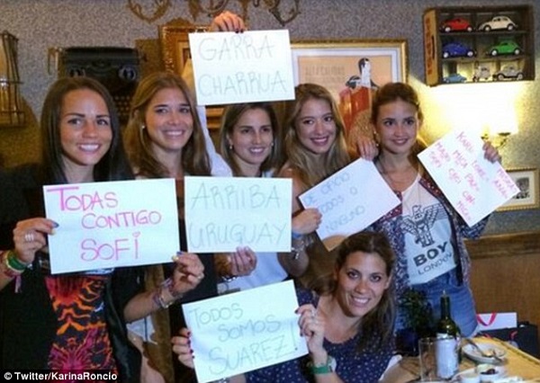 Wives and girlfriends of Uruguay football players have shown their support for Luis Suarez after the striker’s four month ban for biting Italy defender Giorgio Chiellini.