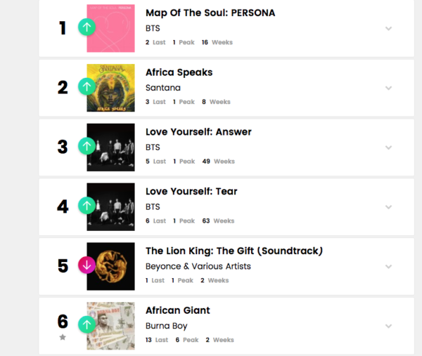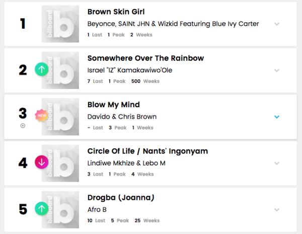 Wizkid’s collaboration with Beyonce on ‘Brown Skin Girl’ from the ‘Lion King: The Gift’ album is number one for the second week in a row, while Davido’s collaboration with Chris Brown on his new single ‘Blow my mind’ debuted on the charts at number three this week.