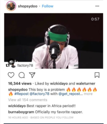 Nigerian afro-dancehall star, Burna Boy and musical colleague, Wizkid who are equally huge African pop stars expressed their strong approval of the South African rapper in a comment section of a video posted by London based- Nigerian OAP, Adesope Olajide.