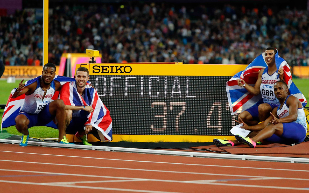 The British quartet won the race in a time of 37.47 seconds, among the fastest times in history. Bolt and Jamaica hold the world record at 36.84