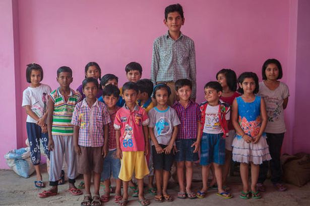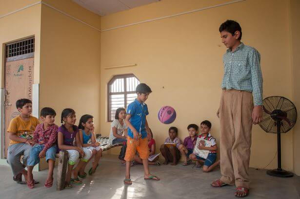 Despite towering above his classmates, Karan manages to do everything his smaller friends do.