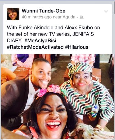Wunmi posted a selfie of herself with Funke Akindele and Alexx Ekubo taken on set today, February 2, 2015 on Facebook. She also disclosed the name of the character she’s playing on the new TV series.