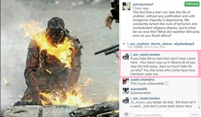 Minutes after Ghanaian actor, John Dumelo took to his Instagram account, today, April 17, 2015 to condemn the xenophobic attacks by South Africans on immigrants from several African countries, an angry South African fan responded, warning the actor not to ever step into the country anymore.