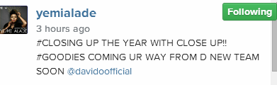 In a recent post on Instagram, Yemi Alade wrote: ‘closing up the year with close up! goodies coming your way from the new team soon.’