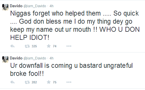 The pop star who is currently in Dubai with his family members, took to Twitter this afternoon to rant about an unnamed person, writing: ‘Niggas forget who helped them So quick God don bless me I do my thing dey go keep my name out ur mouth !! WHO U DON HELP IDIOT! Ur downfall is coming u bastard ungrateful broke fool.’