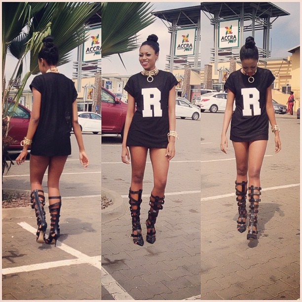 Yvonne Nelson pulls her most daring look so far rocking the Varsity t-shirt on on black gladiator heels with a gold bracelet and necklace. And you’ll agree she has nothing under?