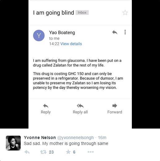 The mother of Ghanaian award winning actress, Yvonne Nelson has revealed that she is presently going blind with the lack electricity in Ghana.