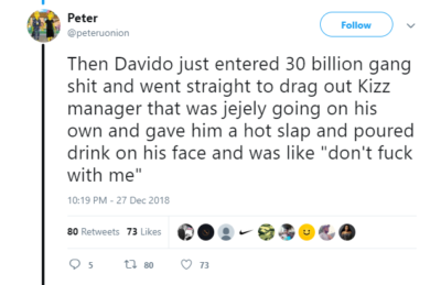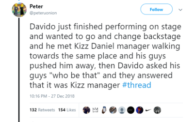 According to reports which have been validated by Tumi Lawrence, Kizz Daniel’s manager and victim of the assault, Davido smacked him on the face because he was seen backstage around Davido’s changing spot. The account which was given by a social media with the username Peter Uoninon also posited that Davido was informed beforehand that the victim was Kizz Daniel’s manager but he went ahead to strike.