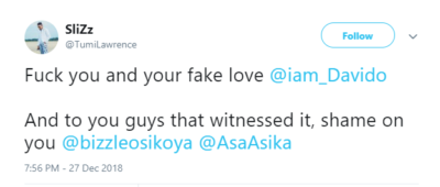 Tumi has gone on Twitter to call out Davido and his manager, Asa Asika who was reportedly also at the assault scene.