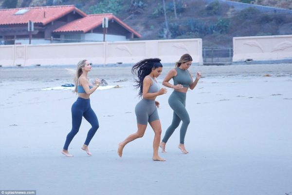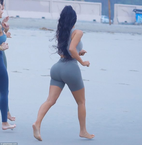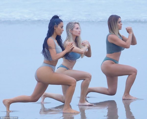But on Wednesday the 37-year-old flaunted her enviable curves in a grey crop top and briefs for a yoga session, accompanied by two female friends at a Los Angeles beach.