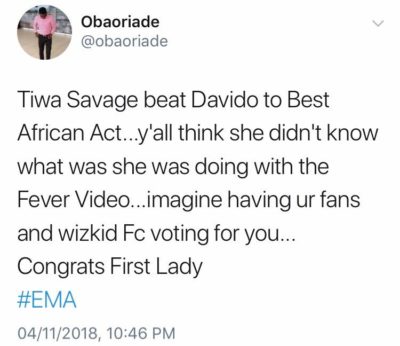 Tiwa Savage beat Davido to Best African Act…y’all think she didn’t know what was she was doing with the Fever Video…imagine having ur fans and wizkid Fc voting for you…